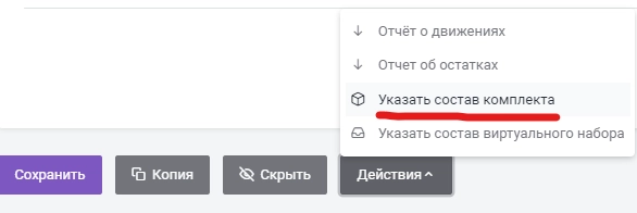 - Внизу страницы выбрать пункт «Действие» и «Указать состав комплекта».