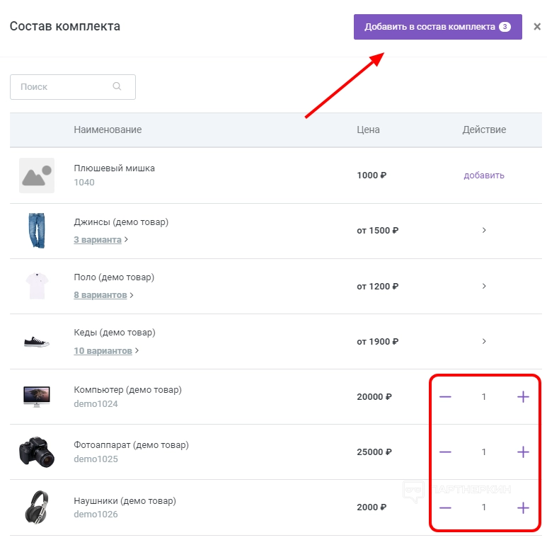 - В меню выбрать составляющие комплекта и их количество. Далее — кликнуть «Добавить в состав комплекта».