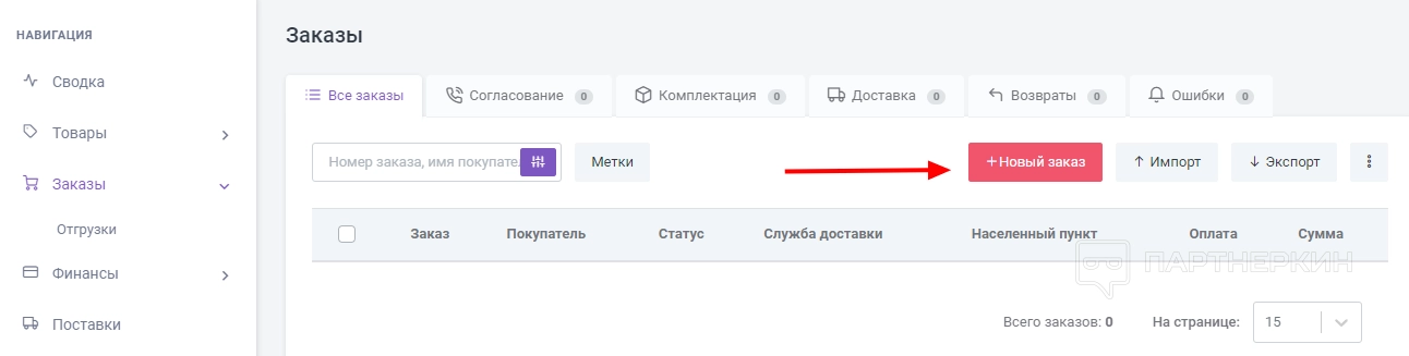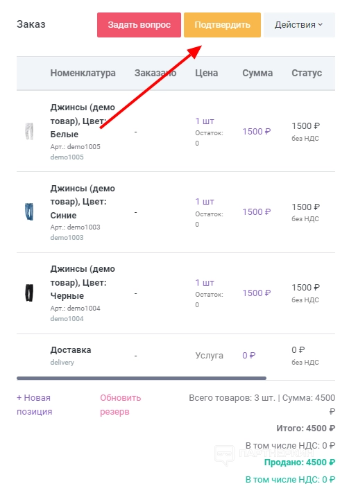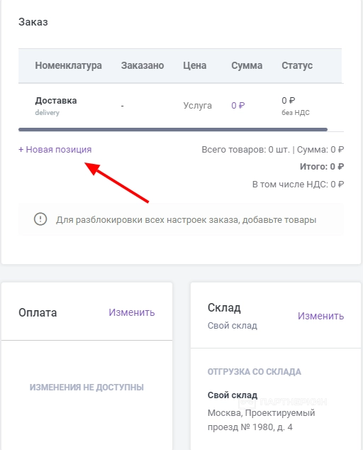 - Добавить товары в заказы. Для этого необходимо кликнуть «Новая позиция».