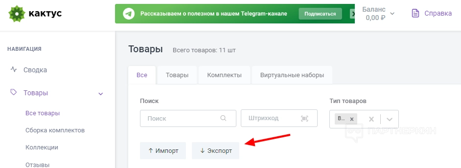 - На панели инструментов перейти во вкладку «Товары» и нажать кнопку «Экспорт».