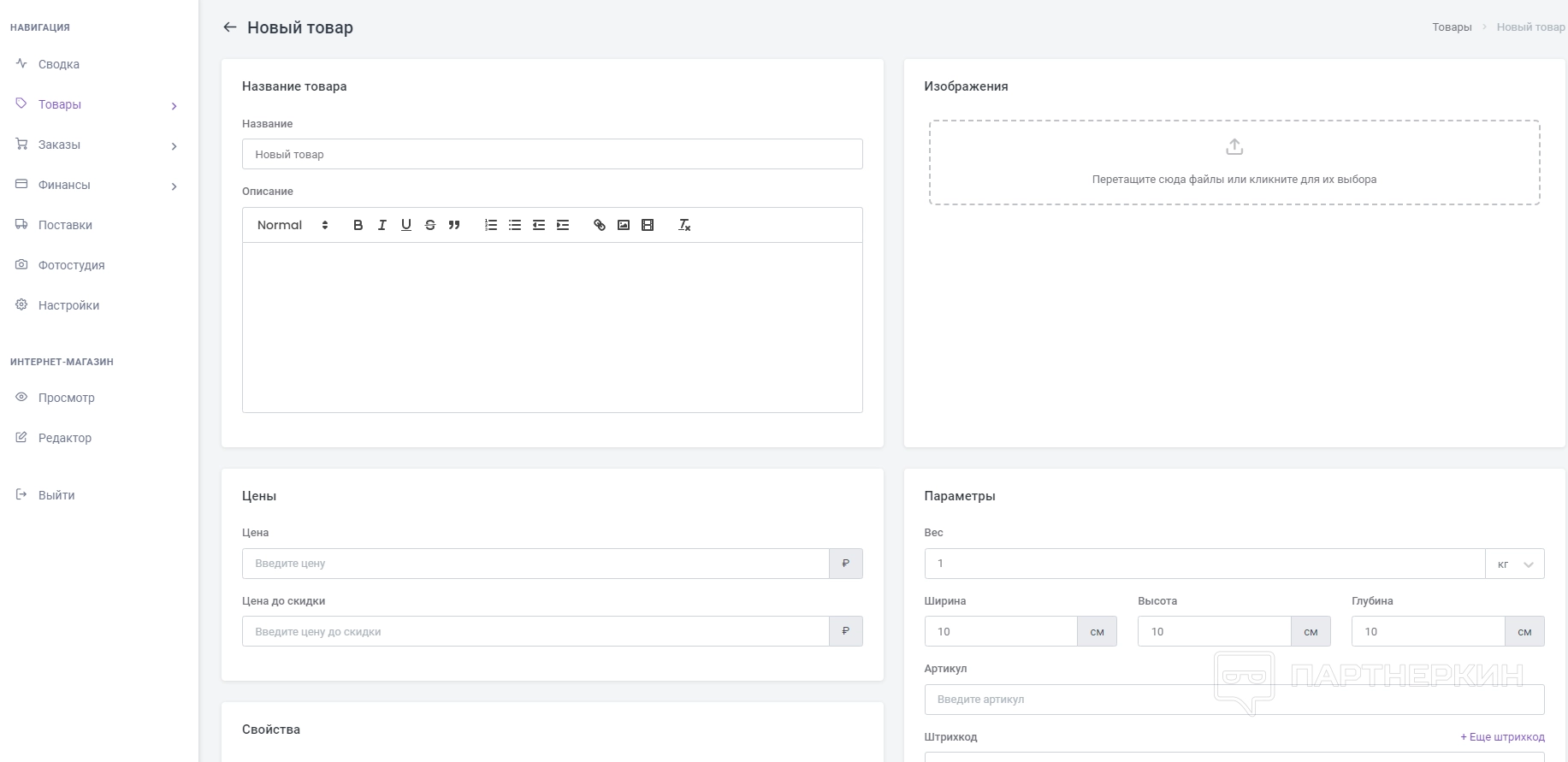 - Заполнить информацию о товаре. Указать название, описание, габариты, стоимость и свойства. Обязательно ввести штрих код и сохранить изменения.