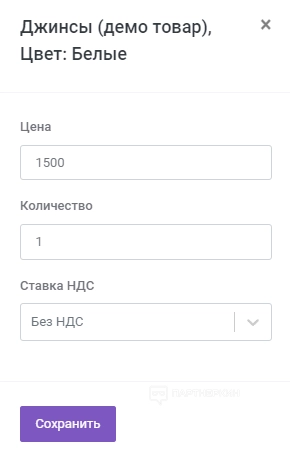- При нажатии на строку добавленного товара пользователь сможет отредактировать количество, цену и ставку НДС.
