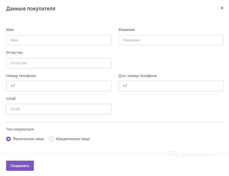 - Чтобы служба доставки смогла связаться с клиентом, нужно обязательно указать телефон и почту. Также необходимо выбрать тип покупателя — физическое или юридическое лицо. Когда все данные о покупателе заполнены — нажать кнопку «Сохранить».