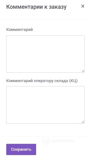 - При необходимости можно оставить комментарий к заказу и к оператору склада.
