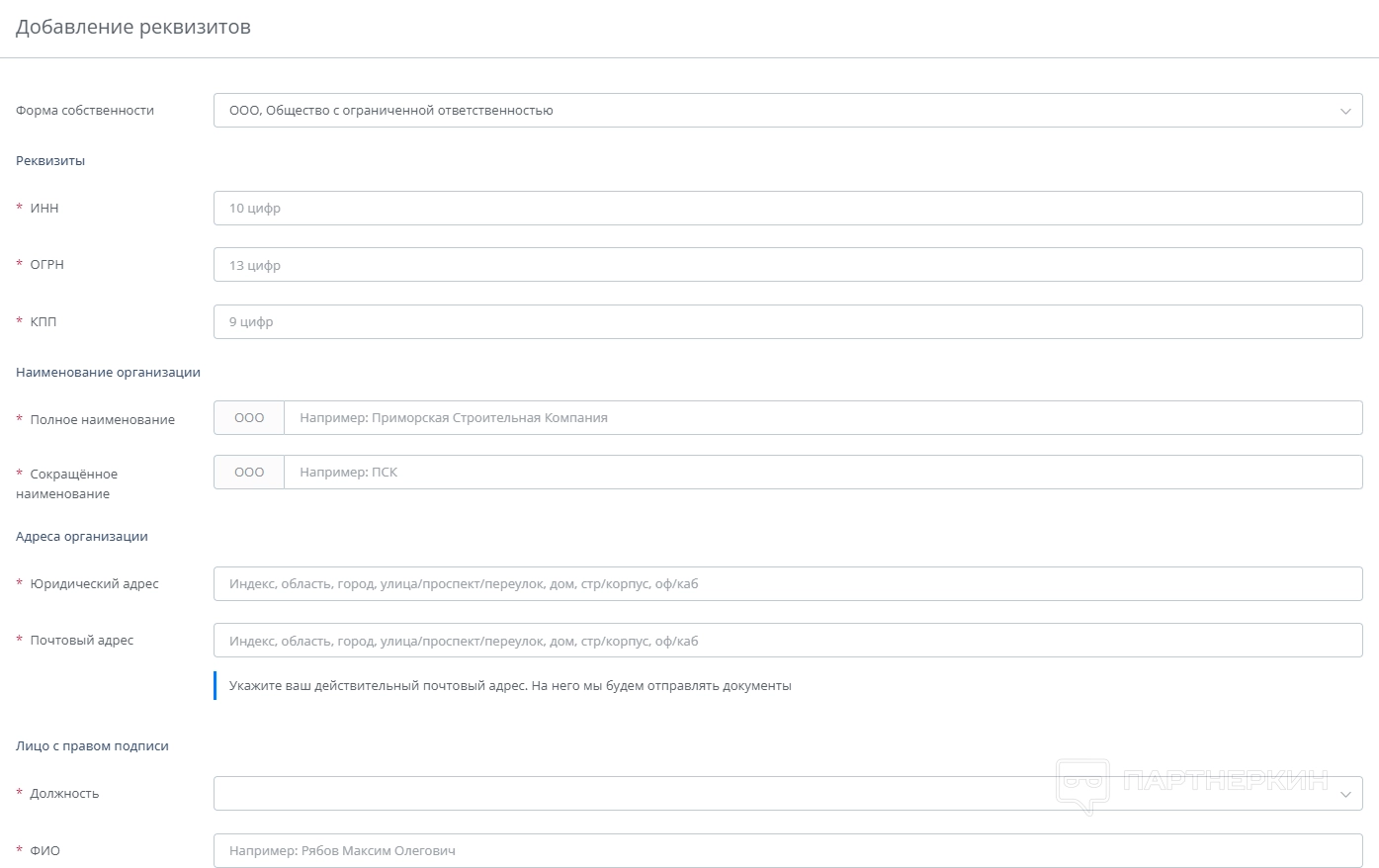 В разделе «Реквизиты» нужно указать форму собственности, заполнить поля и в правом нижнем углу нажать кнопку «Сохранить реквизиты».