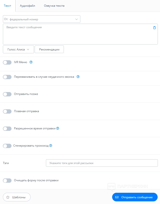 Основные разделы находятся в левом боковом меню. Здесь можно настроить рассылку СМС, голосовую рассылку и так далее.