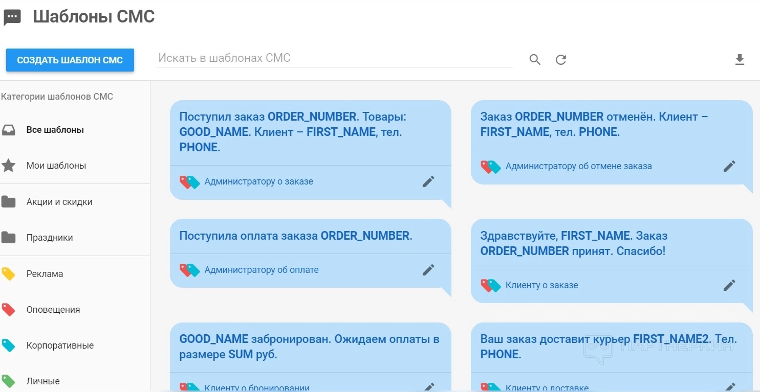 Доступен выбор нескольких шаблонов SMS, можно настраивать пользовательские шаблоны: