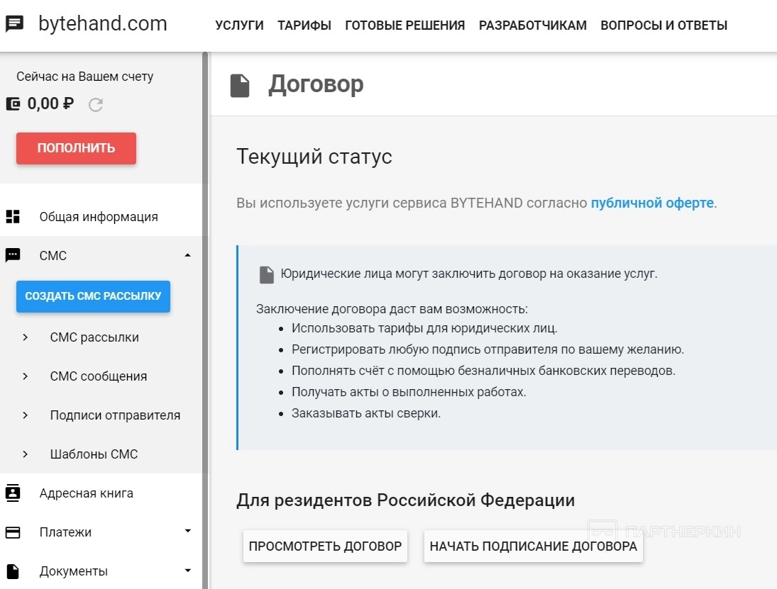Заключить договор с сервисом может не только юрлицо, но и ИП. Заключение договора дает несколько преимуществ: доступ к корпоративным тарифам, высокая скорость отправки SMS, гарантированная мгновенная доставка, индивидуальная подпись имени компании в поле отправителя.