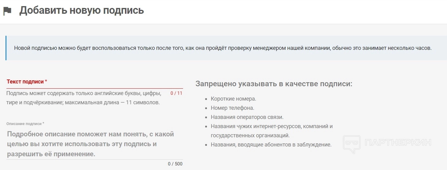 В поле «Отправитель» можно указать произвольное название — любую комбинацию из букв. Ограничение — по количеству символов — не более 11. Можно написать подпись отправителя только на латинице. Индивидуальную подпись могут писать только корпоративные клиенты (юрлица), заключившие договор с
