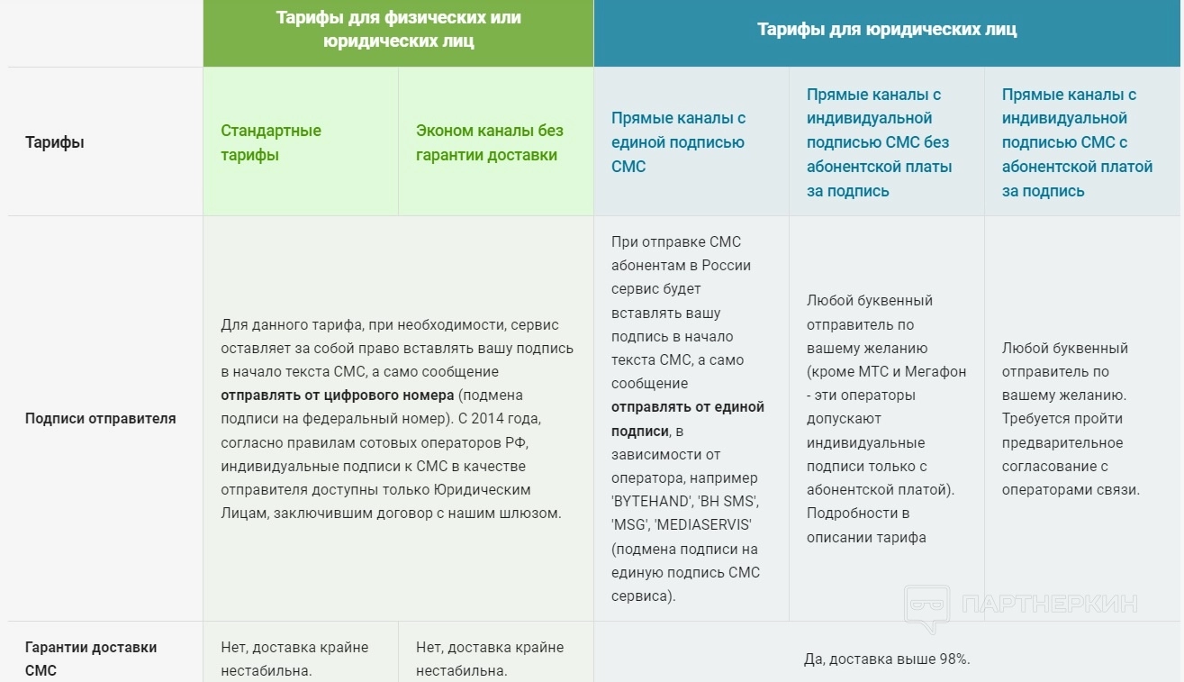 Есть возможность запросить индивидуальный тариф, если нужно отправлять от 200 000 SMS в месяц. Можно выбирать эконом тарифы и прямые тарифы — прямые каналы с единой подписью SMS, каналы с индивидуальной подписью за SMS с абонентской платой за подпись и без нее. Возможность отправлять SMS с подписью действует на тарифах для юрлиц.