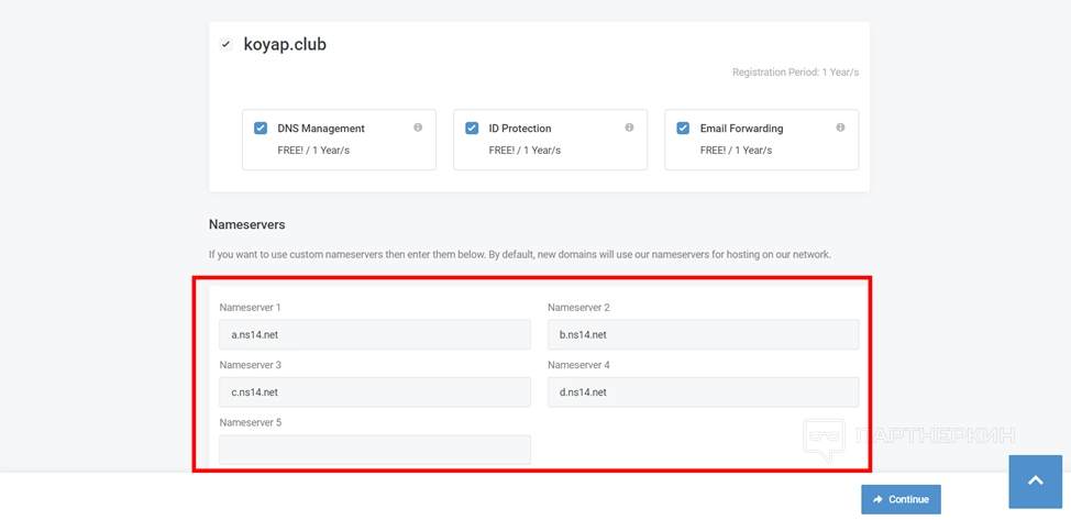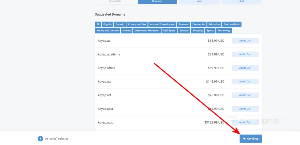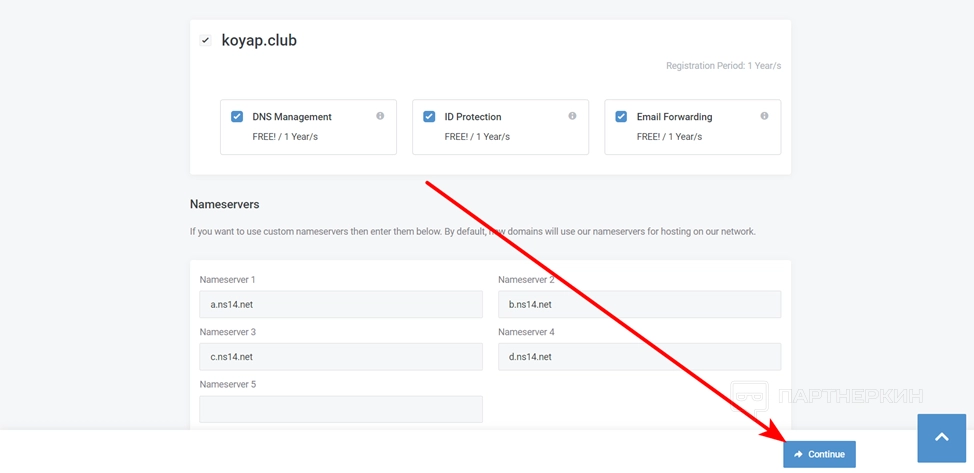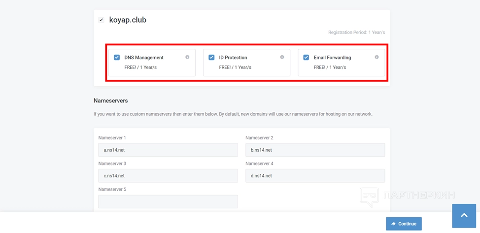 - Выберите нужное количество доменов и нажмите на Continue.