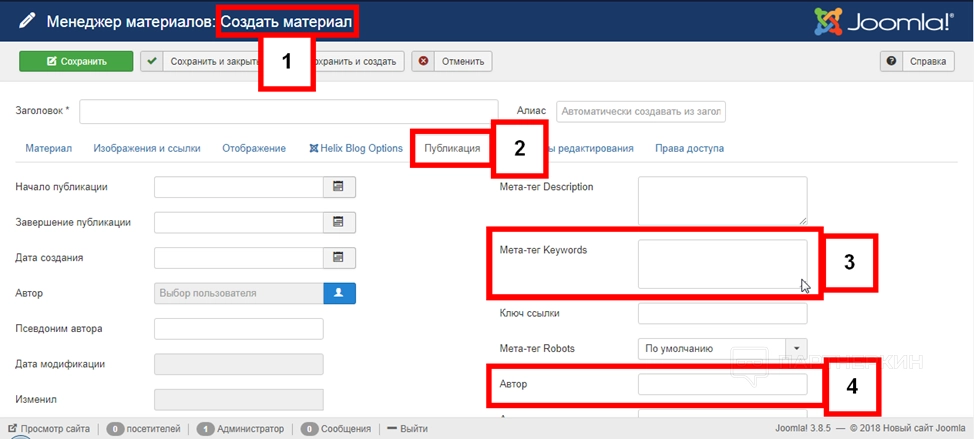 Опция доступна только с версии 4.0. Публикация контента дает возможность запускать сайт сразу на URL-страницу. Для этого во время создания материала (1) откройте вкладку «Публикация» (2). укажите мета-данные категории (2). При необходимости добавьте автора (4).
