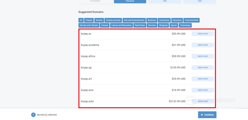 - Система найдет популярные домены и покажет их стоимость.