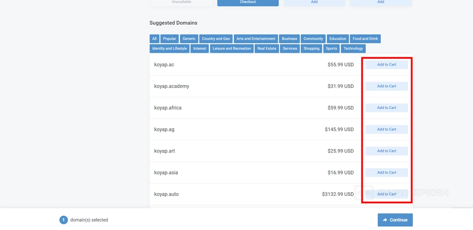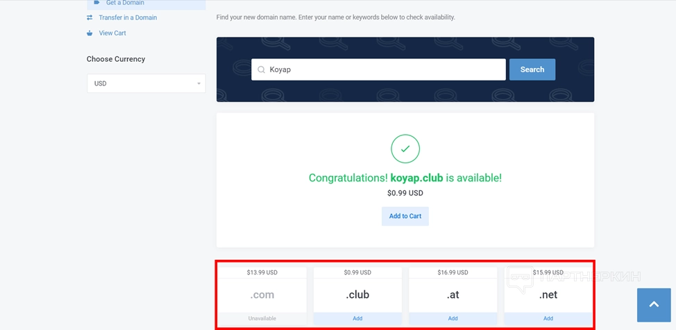- Нажмите на кнопку Add to Cart? Чтобы арендовать домен.