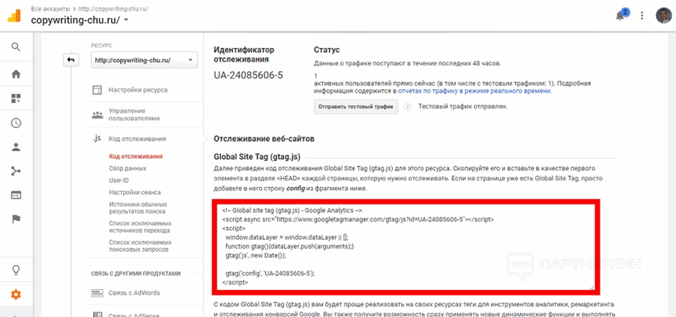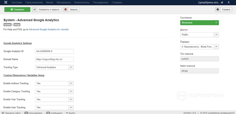 После установки плагина Advanced Google Analytics включите его и перейдите на страницу настроек. Укажите ID идентификатора отслеживания, название домена, выберите подходящие настройки и сохраните изменения. Вы добавили код отслеживания на сайт.