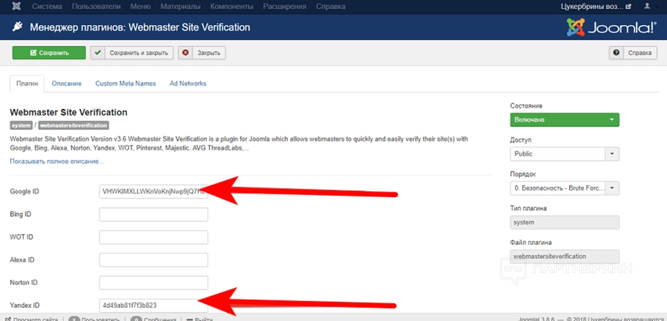 После установки включите плагин и перейдите на страницу настроек. Добавьте идентификаторы верификации сайтов и сохраните изменения. Подтвердите права в кабинетах для вебмастеров Google и «Яндекс».