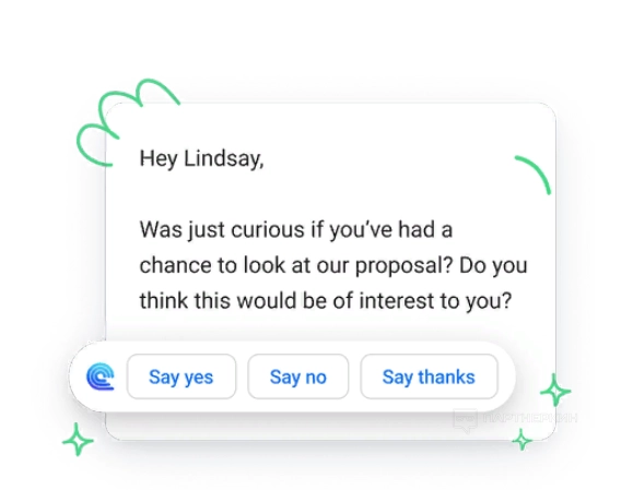 Compose AIстарается расширить список от «Да», «Нет», «Спасибо» более человечными реакциями (кнопки аналогичные, но текст генерируется новый).