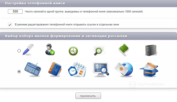 Еще можно настроить телефонную книгу, выбрать набор иконок формирования и активации рассылки.