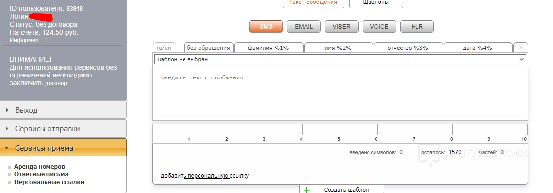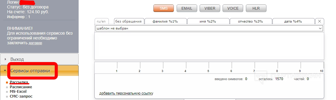 Чтобы отправить СМС через личный кабинет, нужно выбрать категорию «Сервисы отправки» и перейти во вкладку «Рассылка».