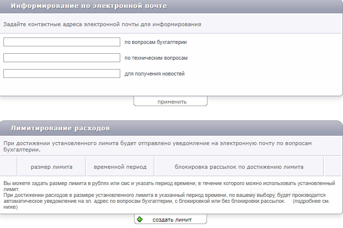 Оповещения. Здесь можно задать контактные адреса электронной почты для информирования, настроить получения ответов абонента и некоторые другие параметры.