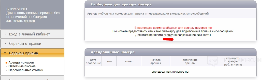 Чтобы воспользоваться этой услугой, необходимо в личном кабинете выбрать раздел «Сервисы приема» и перейти в пункт «Аренда номеров». Если свободных для аренды номеров нет, нужно прислать заявку на подключение сим-карты. Для этого стоит нажать на слово «заявку» и следовать инструкции на экране.