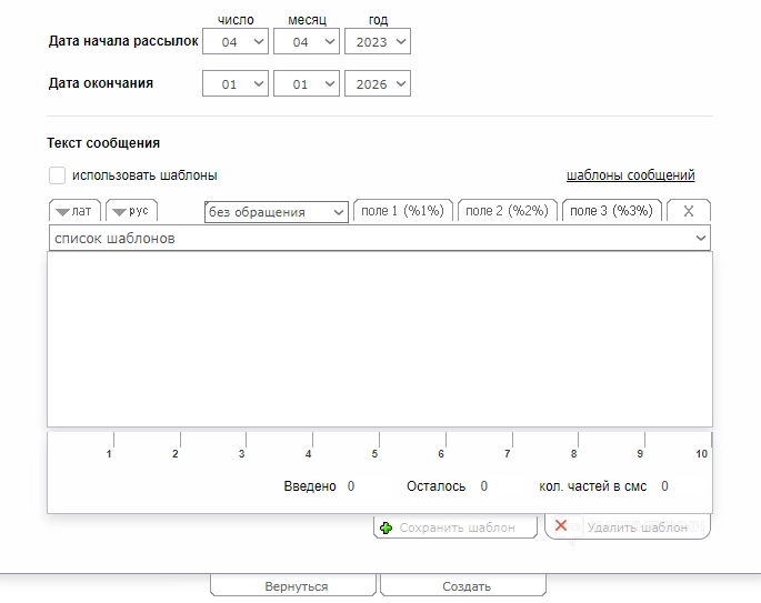 На скриншоте ниже показан пример рассылки для незарегистрированного номера (отправка рассылки невозможна). Если пользователь зарегистрировал телефон, он сможет отправить сообщение. Будет доступна информация по операторам России, стоимости и другим параметрам.