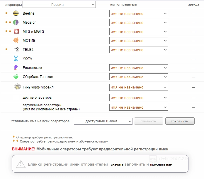 Имя отправителя. В этом пункте можно настроить имена отправителей по странам и операторам. У отмеченных звездочкой операторов потребуется регистрация имени и внесение абонентской платы.