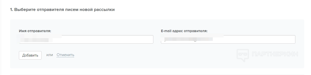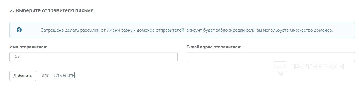 На следующем этапе указываем отправителя письма. Для этого нужно вписать имя и добавить электронную почту, с которой будет осуществляться рассылка. При этом важно добавить ту почту, которая не была использована для регистрации учетной записи.