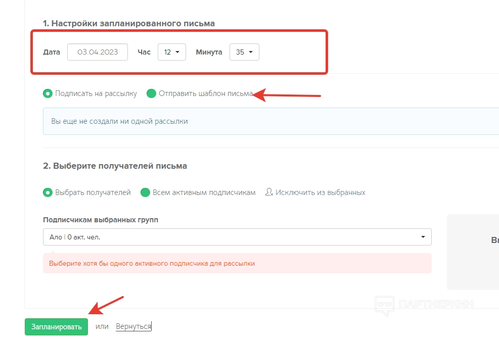 Если рассылку нужно запланировать, переходим во вкладку «Запланировать письмо». В открывшейся форме выбираем дату/время и указываем получателей. Пользователь, кстати, может отправить письмо по заранее подготовленному шаблону. Для этого есть соответствующая кнопка.
