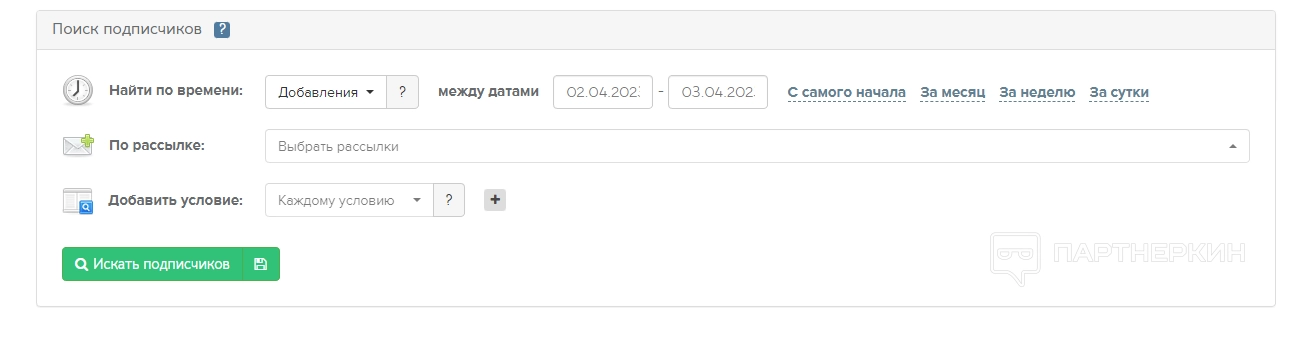 В нижней части раздела есть блок, позволяющий искать подписчиков по таким параметрам, как время, название рассылки и условие.