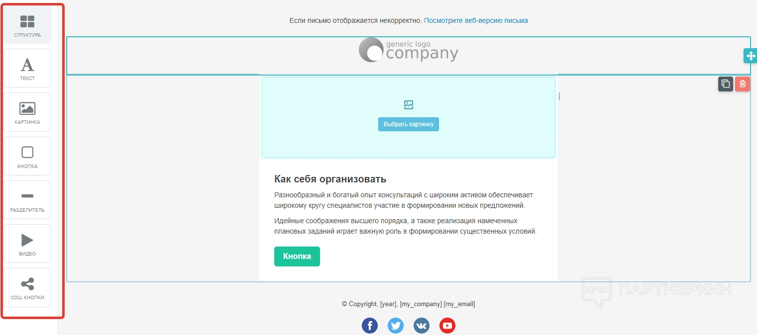 Когда юзер выберет шаблон, откроется редактор, где можно будет вносить изменения в письмо. Для этого в редакторе есть следующие разделы: