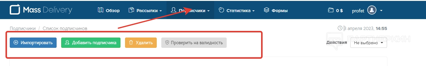 В этом разделе добавляются подписчики, которым будут рассылаться письма. В верхней части экрана находится блок с кнопками управления: