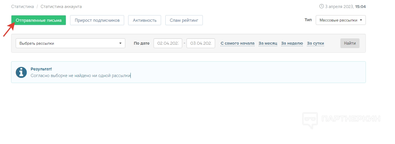 - Отправленные письма . Сведения по отправленным письмам распределяются по дате (сутки, неделя, месяц) и типу рассылки (массовая, автоматическая, с условием).