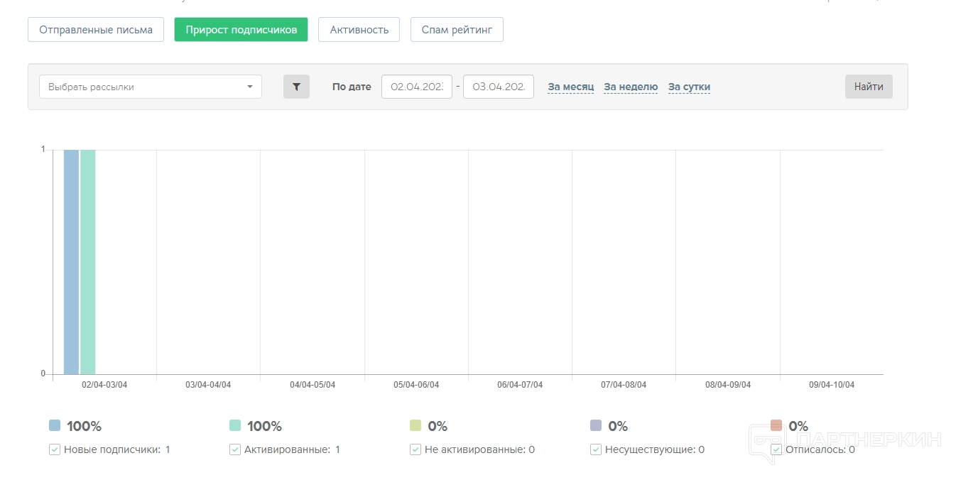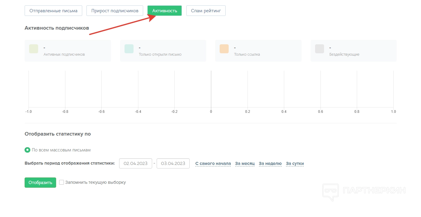 - Активность . Здесь отображаются статистика по подписчикам, которые открыли письма или ссылку. Также есть информация по активным и бездействующим участникам.
