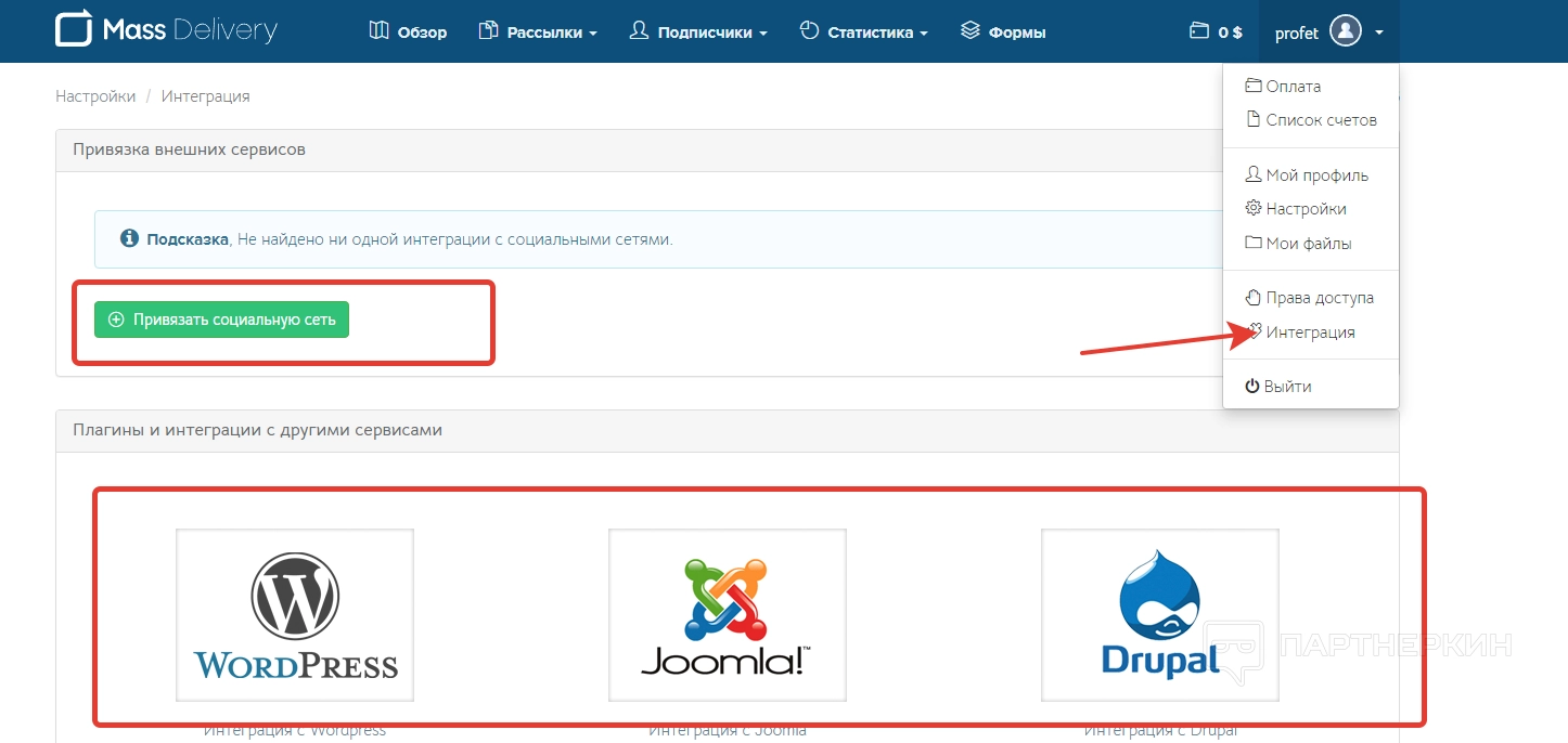 Также стоит обратить внимание на вкладку «Интеграция», где можно интегрировать свою учетную запись со следующими платформами: