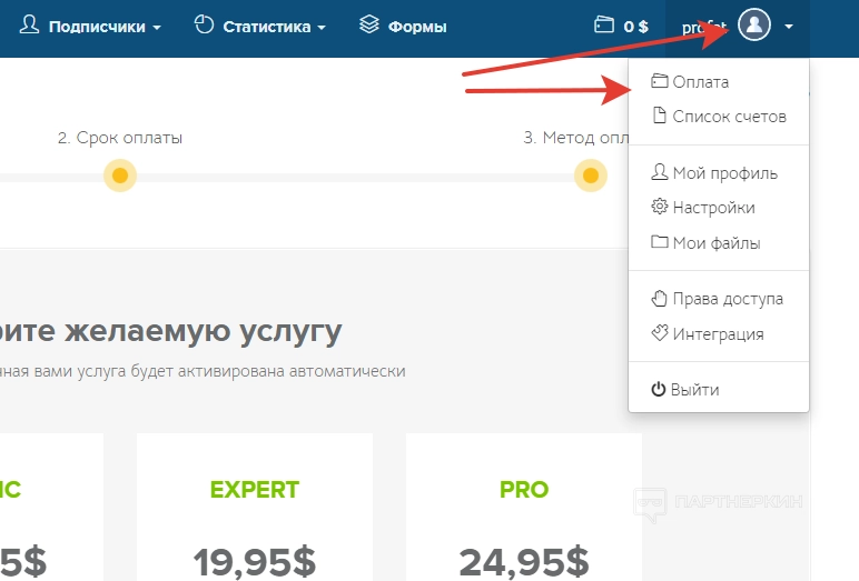 Для приобретения подписки кликаем на аватарку в правом верхнем углу и выбираем в меню «Оплата».