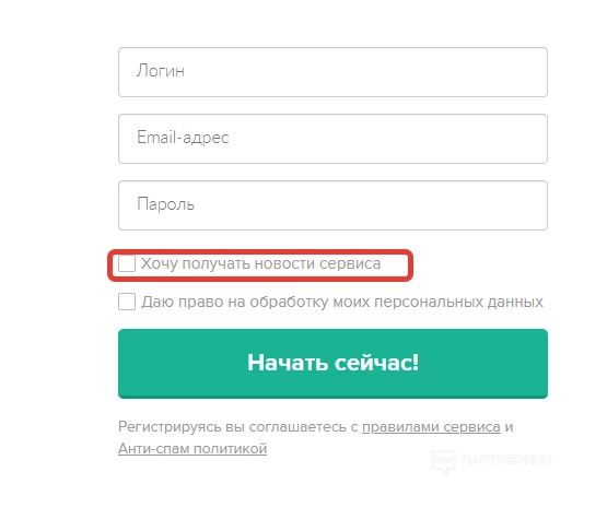 В процессе регистрации нужно указать логин, электронную почту и пароль. Также придется дать согласие на обработку персональных данных. При необходимости ставим галочку напротив «Хочу получать новости сервиса». В этом случае на привязанную почту будут приходить письма с полезной информацией.
