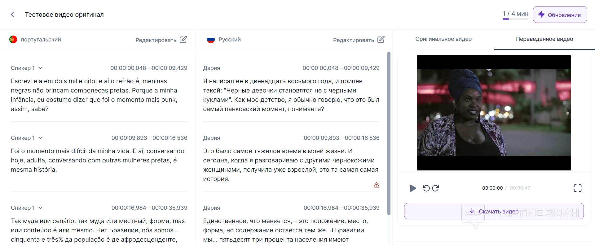 Однако стоит учитывать, что использование сервиса платное, а также возможны неточности при переводе. Поэтому в случае обнаружения неточностей лучше использовать функцию редактирования и заменять эти части текста. Также с помощью данной функции можно легко менять голоса спикеров и добавлять новые текстовые блоки в перевод по необходимости.