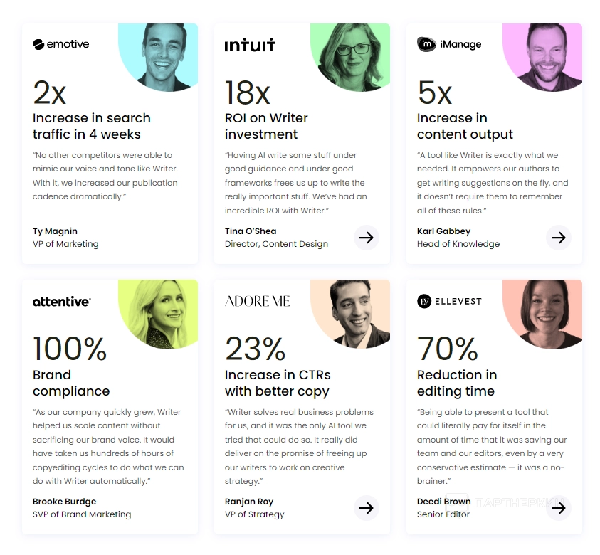 Количество компаний, решающих начать сотрудничество с Writer, растет с каждым днем — для этого достаточно обратиться к разделу кейсов внутри сайта и выбрать наиболее подходящий по рабочей сфере.