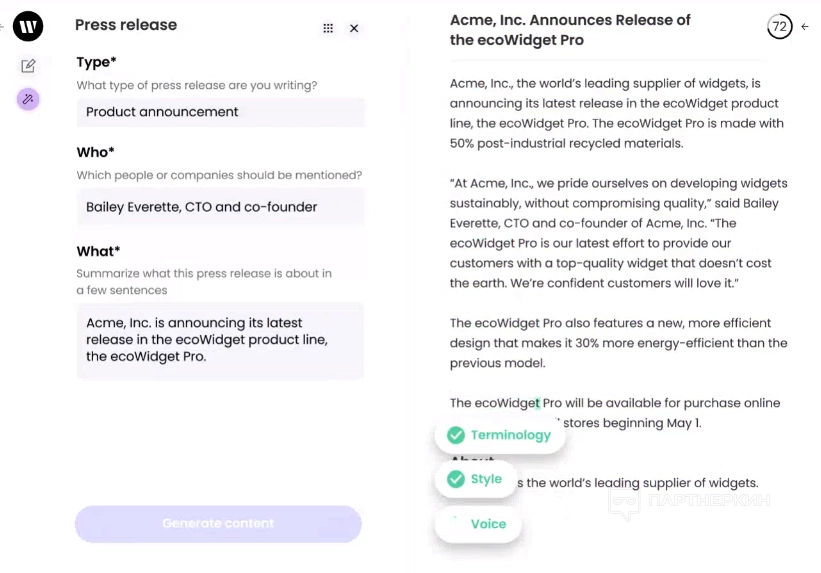 1. CoWrite Templates. Впечатляющий заголовок, пресс-релиз или общий смысл текста — основные вопросы бизнеса будут решены, а возможность персонализировать формат текста для себя облегчит работу отдела маркетинга. Последняя возможность заключается в вопросе «Who» от системы — анализируя деятельность разных представителей команды, их почерк и фразы, алгоритм старается создавать максимально качественные посты.