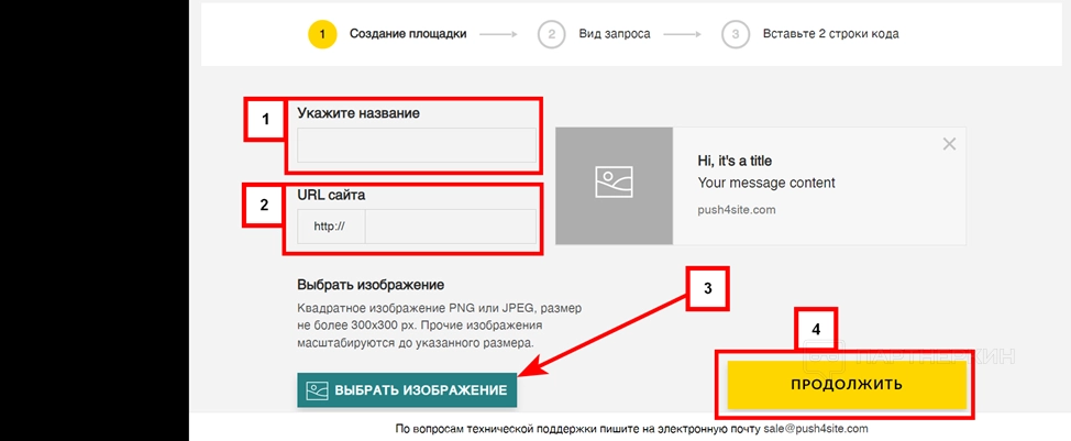 - Создайте площадку. Для этого укажите название (1), вставьте URL своего сайта (2), выберите изображение (3). Нажмите «Продолжить» (4).