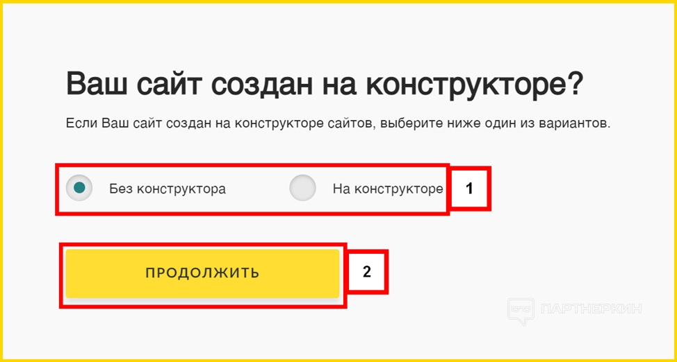 - Выберите тип сайта. Он создан на конструкторе или без (1).