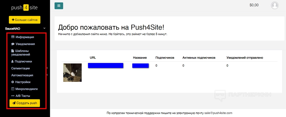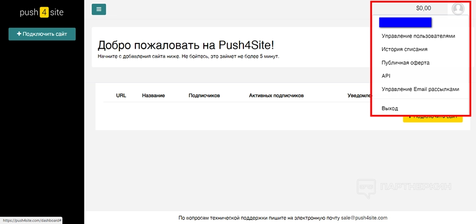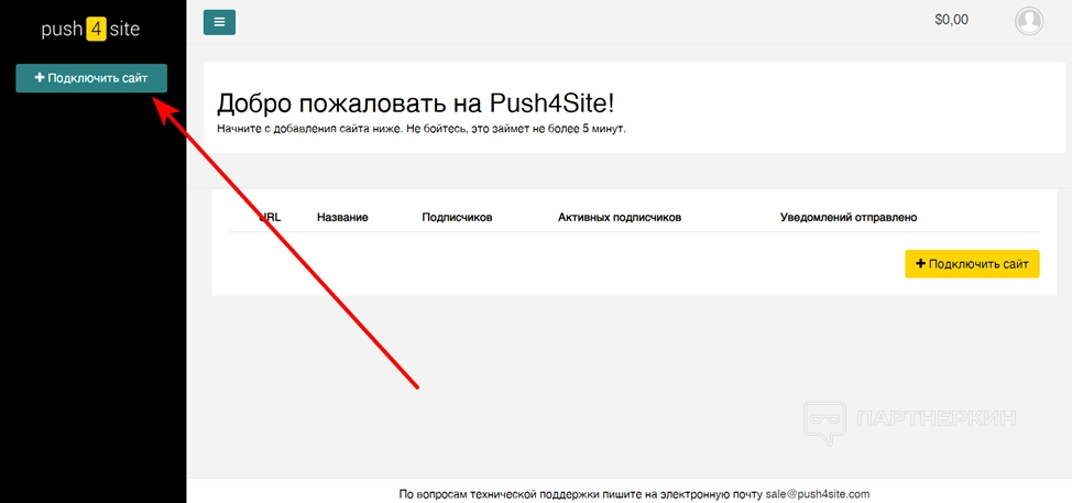 Боковая панель после регистрации будет пустой. Кроме одной кнопки «Подключить сайт».