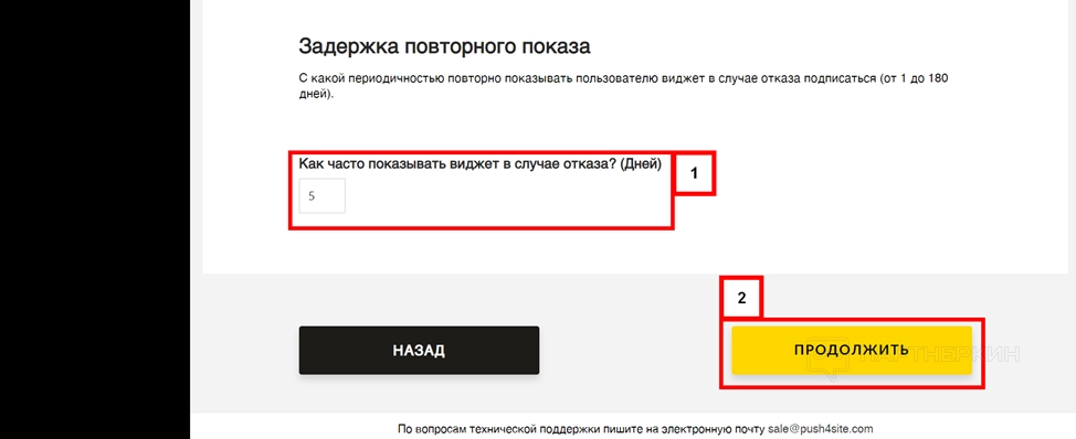 - Введите число, как часто показывать виджет в случае отказа (в днях) (1).