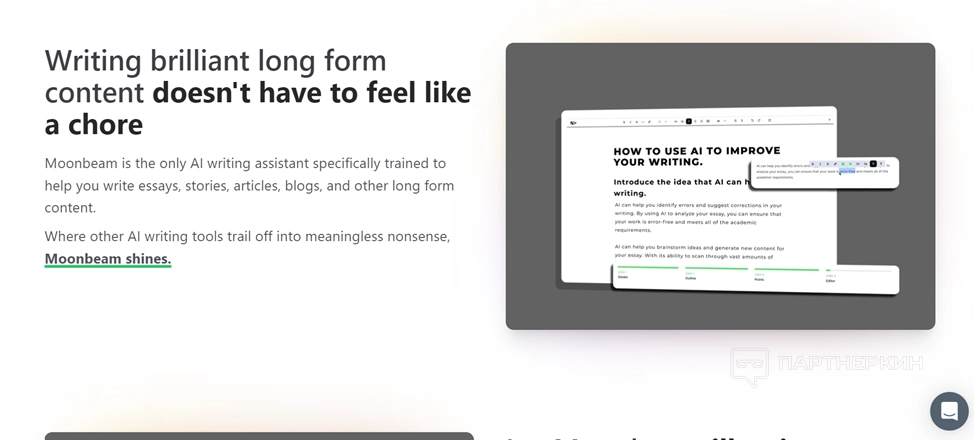 Особенность ресурса заключается в том, что ИИ действительно улучшает контент. Редактор мгновенно преобразует набор слов в полезный план. Дальше ИИ формирует грамотно написанные абзацы.