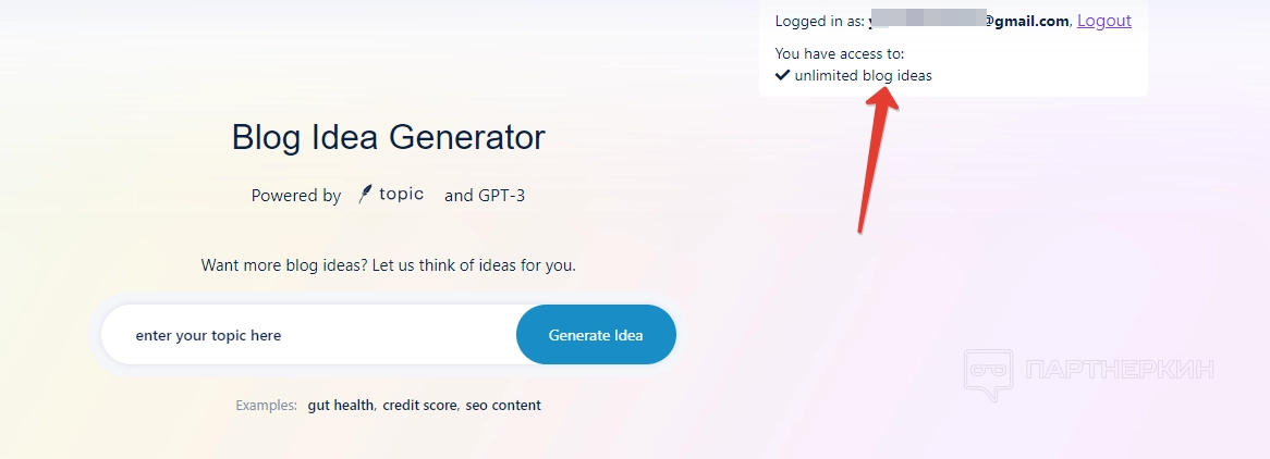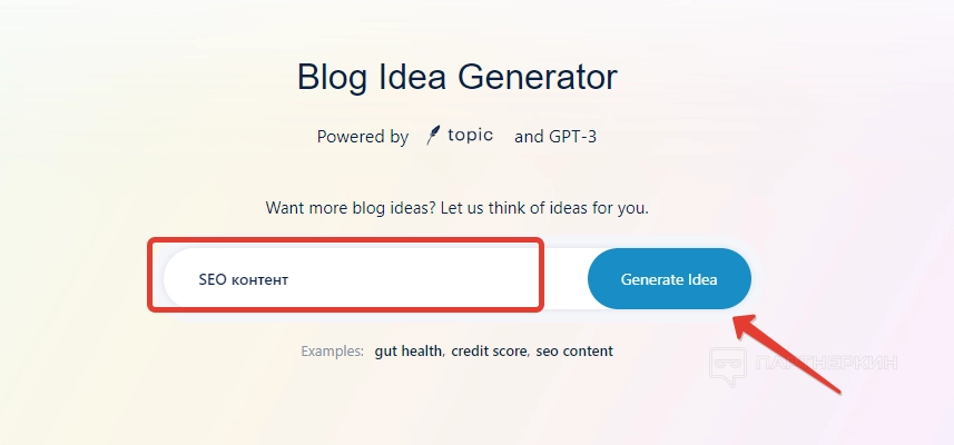 Теперь можно приступать к генерации идей. Для этого достаточно вписать всего одну фразу в соответствующую строку и нажать на кнопку Generate Idea . Например, SEO content.