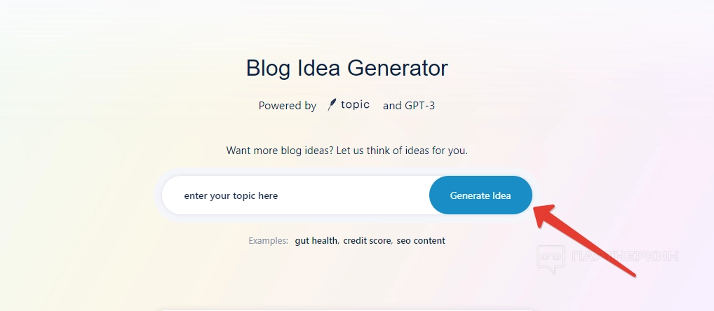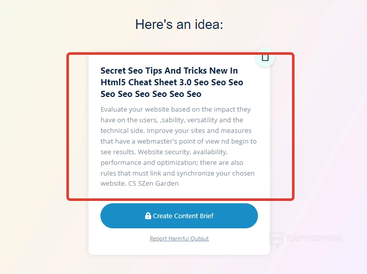Генератор идей работает по принципу анализа и составления контента под заранее выбранные ключевые слова. Сервис ориентируется на использованный ключ и анализирует на его основе контент в Google. Далее релевантный материал подключается к GPT-3 и с помощью ИИ проходит уникализацию.