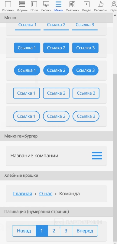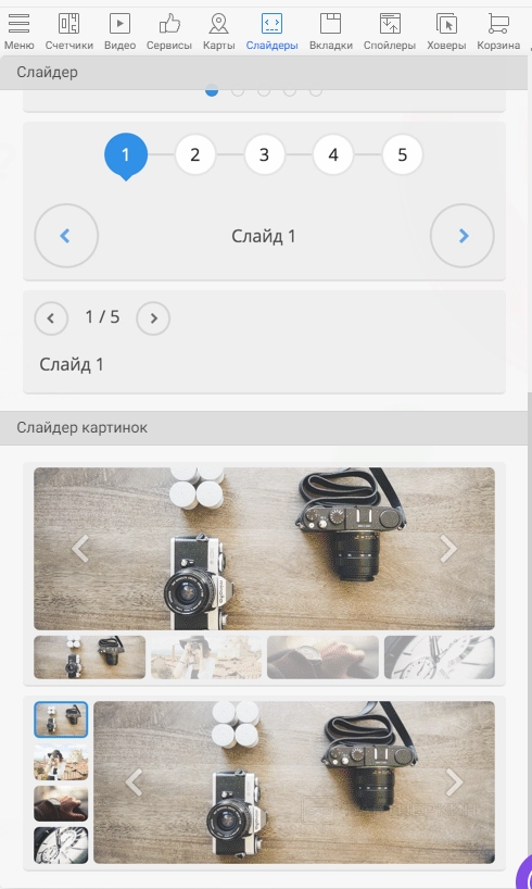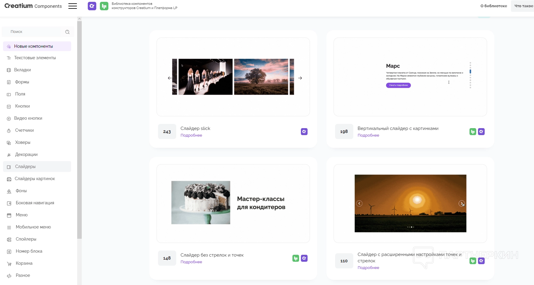 Подробный список других компонентов представлен в библиотеке. Здесь можно посмотреть примеры готовых модификаций. Некоторые слайдеры выглядят так: