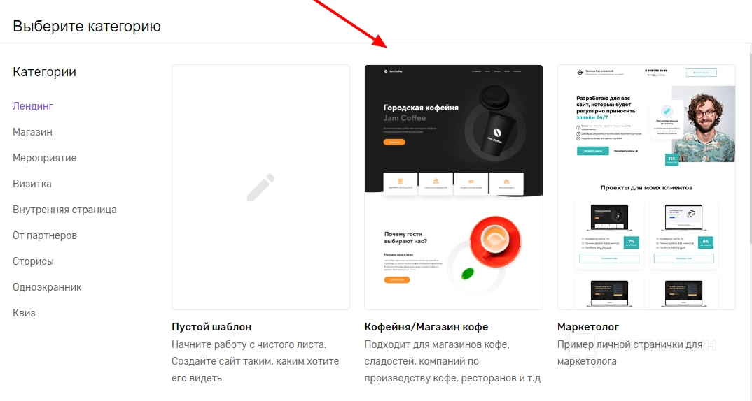 Для создания сайта перейдем в категорию «Лендинг» и выберем шаблон «Кофейня/Магазин кофе». В описании указано: «Подходит для магазинов кофе, сладостей, компаний по производству кофе, ресторанов».