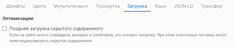 Загрузка . Здесь пользователь может включить опцию «Поздняя загрузка скрытого содержимого» (если на сайте много слайдеров, вкладок и спойлеров, это ускорит загрузку. Однако поисковые системы могут хуже индексировать скрытое содержимое).